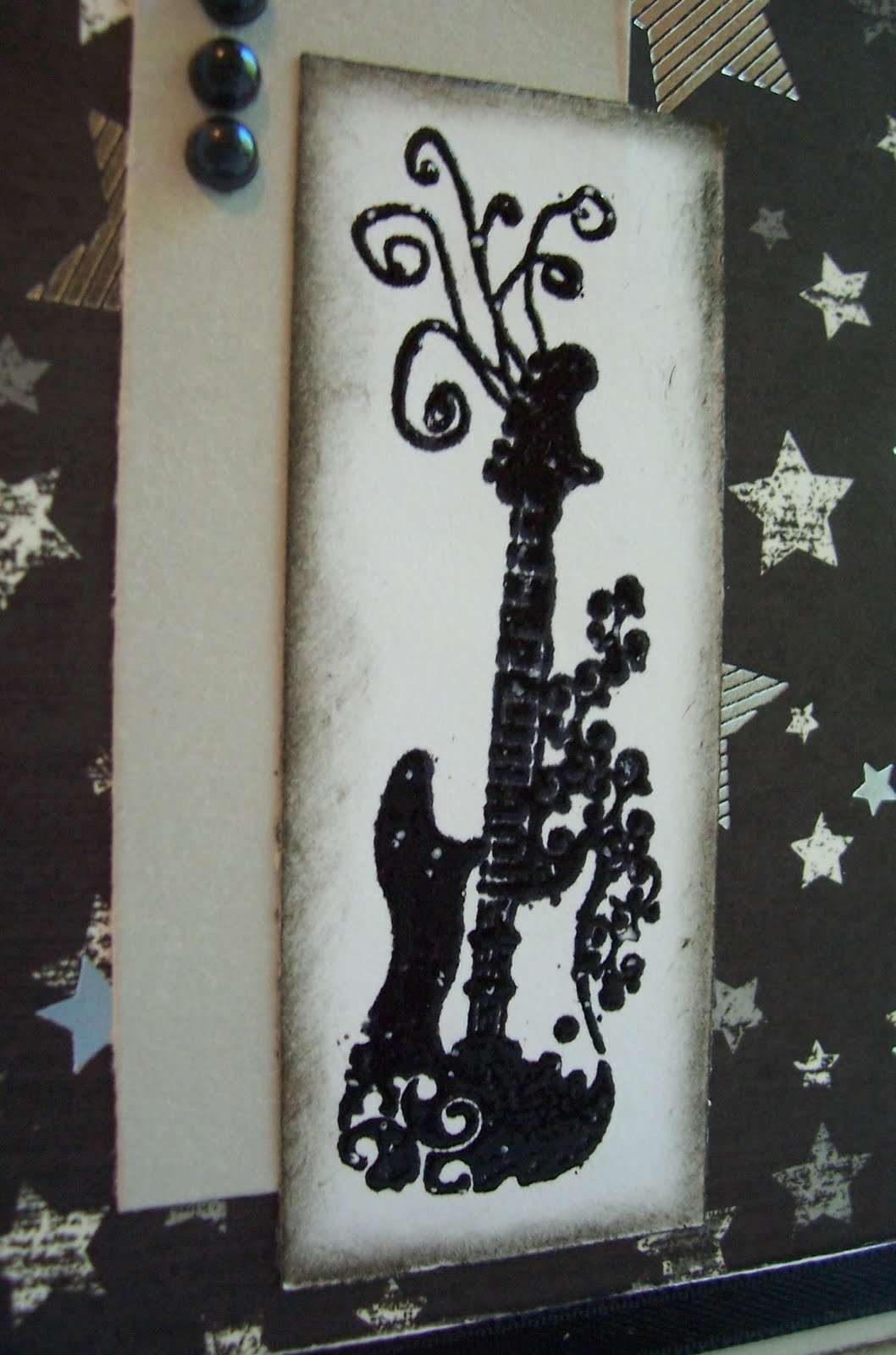 Above is a closeup of the guitar image that has been handstamped and embossed with black embossing powder. Then I added blank ink around the edges with a blending tool to distress the sides for some texture. I had originally cut out the silver metallic paper to use as a matting for the guitar image. However, I layed it down, went off to do something else and when I came back to it it was askew and off to the side. Well, I thought I kinda like that and that's how it ended up being placed on the card.
